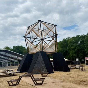 De Crowd Roof is een constructie van stalen en houten palen in de vorm van een enorme driehoekstruss. Interesse?